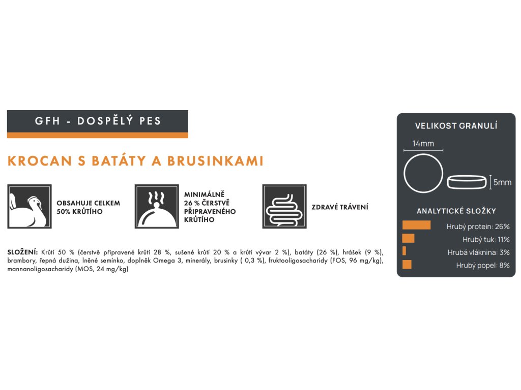 Každá receptura obsahuje minimálně 26 % čerstvě připravených vysoce kvalitních bílkovin. Nejkvalitnější čerstvě připravené maso se vaří při mírné teplotě 82 stupňů, aby byly chráněny cenné bílkoviny, zvýšila se stravitelnost a zvýraznily se chutě.