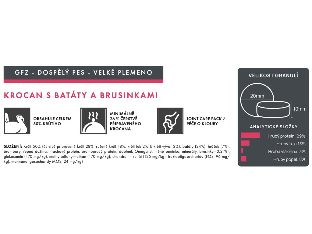 Každá receptura obsahuje minimálně 26 % čerstvě připravených vysoce kvalitních bílkovin. Nejkvalitnější čerstvě připravené maso se vaří při mírné teplotě 82 stupňů, aby byly chráněny cenné bílkoviny, zvýšila se stravitelnost a zvýraznily se chutě.